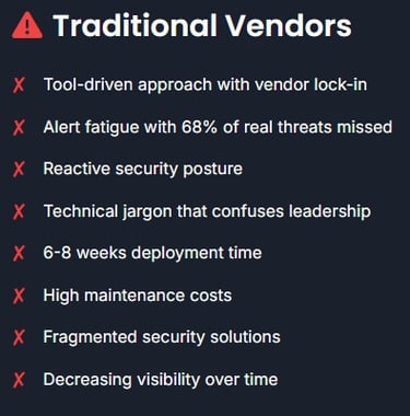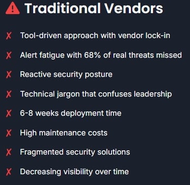 40+ security tools that don't communicate, creating alert fatigue without actionable insights.