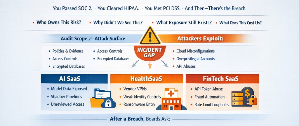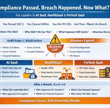 Blog post descAI SaaS, HealthSaaS, and FinTech SaaS companies are clearing audits—yet breaches still happen. This article confronts the uncomfortable leadership gap between compliance and real risk ownership, exposing the decisions founders and boards avoid until an incident forces accountability.