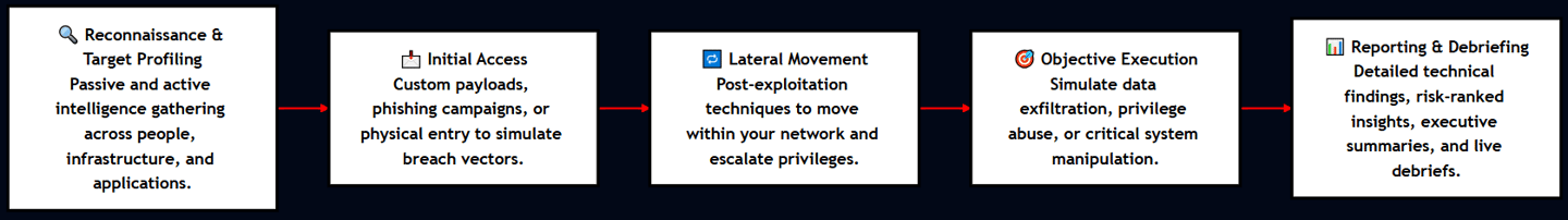 Our Red Teaming Services follow a structured and methodical approach, providing a comprehensive assessment of your security posture. The process is broken down into key phases, each involving specific activities designed to simulate the actions of real-world adversaries.